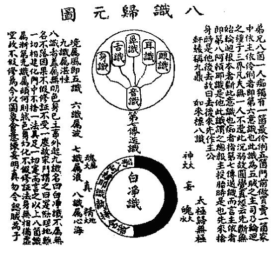 八识者,皆属无明色身己土事。外起九识,名日白净识,不属无名,不落因果,不假修证,不受一尘。故宗门谓日:实际理地,离一切相,建化门中,不舍一法,其是一切。实而言之,以上八个识属渐,第九识属顿何则。然色身幻化,不假修证。法身无相,犹若虚空,故不假修为。今以图象会意,拣妄明真,勿合认贼为子。