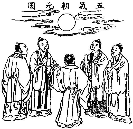一气初判而列二仪,二仪定位而分五常,五常异地而各守一方,五方异气而各守一子。青帝之子名龙烟,受甲乙木德之三气。赤帝之子名丹元,受丙丁火德之二气。白帝之子名皓华,受庚辛金德之四气。黑帝之子名玄冥,受壬癸水德之一气。黄帝之子名常存,受戊己土德之五气。故金得土则生,木得土则旺,水得土则止,火得土则息。唯圣人知回几之道、得还元之理。于是攒五簇、四会、三合、二而归一也。盖身不动则精固而水朝元,心不动则气固而火朝元,真性寂则魂藏而木朝元,妄情忘则魄伏而金朝元,四大安和则意定而土朝元。此谓五气朝元,皆聚于顶也。