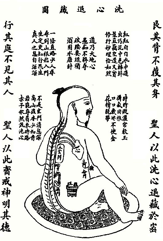 易之洗心退藏于密这句话头,唐宋神仙谓之沐浴,近代诸人标为艮背,总只是这个道理,这个窍妙。原夫心属乎火,而藏之以背之水者,洗之之义也,心居乎前,而藏之以背之后者,退之之义也。