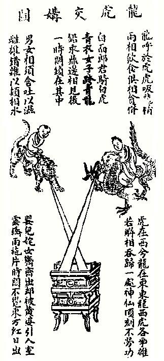 张平叔金丹四百字云:龙从东海来,虎向西山起,两兽战一场,化作一泓水。亦此义也。