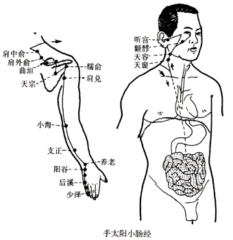 手太阳小肠经:从小指外侧末端开始(少泽),沿手掌尺侧(前谷、后溪),上向腕部(腕骨、阳谷),出尺骨小头部(养老),直上沿尺骨下边(支正),出于肘内侧当肱骨内上髁和尺骨鹰嘴之间(小海),向上沿上臂外后侧,出肩关节部(肩贞、臑俞),绕肩胛(天宗、秉风、曲垣),交会肩上(肩外俞、肩中俞;会附分、大杼、大椎),进入缺盆(锁骨上窝),络于心,沿食管,通过膈肌,到胃(会上脘、中脘),属于小肠。 它的支脉:从锁骨上行沿颈旁(天窗、天容),上向面颊(颧髎),到外眼角(会瞳子髎),弯向后(会和髎),进入耳中(听宫)。