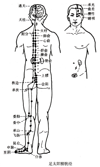 [本经穴]睛明、攒竹、眉冲、曲差、五处、承光、通天、络却、玉枕、天柱、大杼、风门、肺俞、厥阴俞、心俞、督俞、膈俞、肝俞、胆俞、脾俞、胃俞、三焦俞、肾俞、气海俞、大肠俞、关元俞、小肠俞、膀胱俞、中膂俞、白环俞、上髎、次髎、中髎、下髎、会阳、承扶、殷门、浮郄、委阳(三焦下合)、委中(合)、附分、魄户、膏肓、神堂、譩譆、膈关、魂门、阳纲、意舍、胃仓、肓门、志室、胞肓、秩边、合阳、承筋、承山、飞扬(络)、跗阳、昆仑(经)、仆参、申脉、金门(郄)、京骨(原)、束骨(输)、足通骨(荥)、至阴(井)。