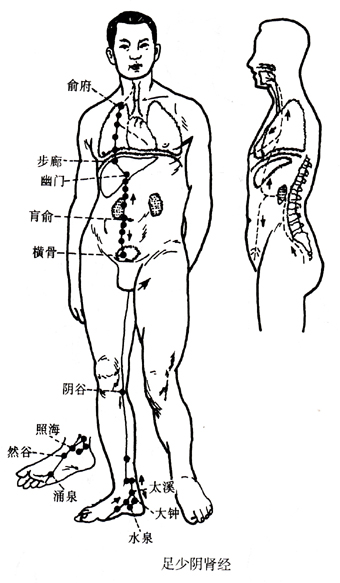足少阴肾经:从脚小趾下边开始,斜向脚底心(涌泉),出于舟骨粗隆下(然谷、照海、水泉),沿内踝之后(太溪),分支进入脚跟中(大钟);上向小腿内(复溜,交信;会三阴交),出窝内侧(筑宾、阴谷),上大腿内后侧,通过脊柱(会长强)属于肾、络于膀胱(肓俞、中注、四满、气穴、大赫、横骨;会关元、中极)。