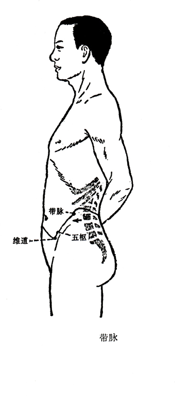 带脉的“带”字,含有腰带的意思。因其横行于腰腹之间,统束全身直行的经脉,状如束带,故称带脉。带脉的主要功能,总的说来是“约束诸经”。它从第二腰椎发出,围腰一周。因此,足部的阴阳经脉都受带脉的约束。由于带脉出自督脉、行于腰腹,腰腹部是冲、任、督三脉脉气所发之处(冲、任、督皆起于胞中),所以带脉与冲、任、督三脉的关系极为密切。