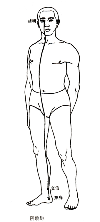 阴跷者,足少阴之别脉,其脉起于跟中足少阴然谷穴之后,同足少阴循内踝下照海穴,上内踝上二寸,以交信为郄,直上循阴股,入阴,上循胸,入缺盆,上出人迎之前,至喉咙,交贯冲脉,入鼽内廉,上行属目内眦,与手足太阳、足阳明、阳跷五脉会于睛明而上行。(按:阴、阳跷交会穴《甲乙》原无睛明,据《素问》王注补。)
