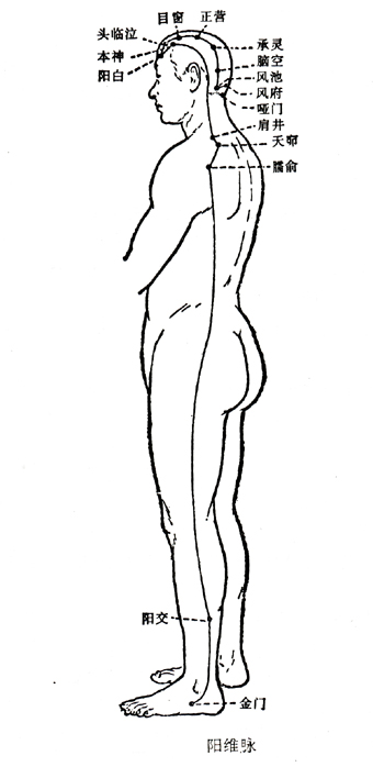 阳维起于诸阳之会,其脉发于足太阳金门穴,在足外踝下一寸五分,上外踝七寸,会足少阳于阳交,为阳维之郄,循膝外廉上髀厌抵少腹侧,会足少阳于居髎,循胁肋斜上肘、上会手阳明、手足太阳于臂臑,过肩前,与手少阳会于臑会,天髎,却会手足少阳、足阳明于肩井、入肩后,会手太阳、阳蹻于臑俞,上循耳后,会手足少阳于风池,上脑空、承灵、正营、目窗、临泣,下额与手足少阳,阳明五脉会于阳白,循头入耳,上至本神而止。凡二十二穴。