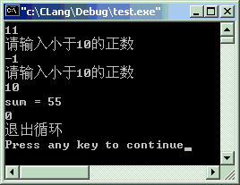 #include<stdio.h>intmain(void) {inti, sum=0;while(1) { scanf("%d", &i);if(i > 10 || i < 0) { printf("请输入小于10的正数\n");continue; }else if(i == 0) { printf("退出循环\n");break; } sum = 0;do{ sum = sum + i ; i--; }while(i > 0); printf("sum = %d\n", sum); }return0; }