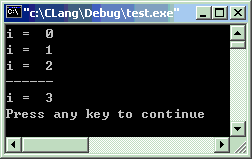 #include<stdio.h>intmain(void) {inti;for(i = 0; i < 3; i++) { printf("i = %2d\n", i); } printf("------\ni = %2d\n", i);return0; }