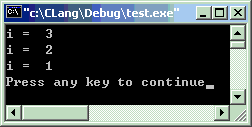 #include<stdio.h>intmain(void) {inti = 3 ;for( ; ; ) { printf("i = %2d\n", i--) ;if(i == 0)break; }return0; }