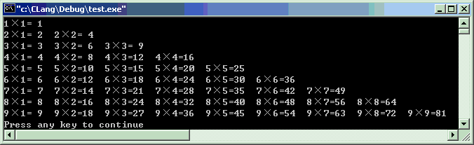 #include<stdio.h>intmain(void) {inti, j ;for( i = 1; i < 10; i++ ) {for( j = 1; j <= i; j++ ) { printf("%d×%d=%2d ", i, j, i * j); } printf("\n"); }return0; }![]()
