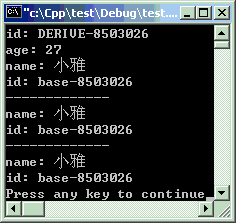 #include<iostream>#include<string>using namespacestd;classCBase { string id; string name;public: CBase(string s1, string s2) : name(s1), id("base-"+s2) { }voidshow() { cout << "name: " << name << endl; cout << "id: " << id << endl; } };classCDerive :publicCBase { string id;intage;public: CDerive(string s1,inta, string s2) : age(a), id("DERIVE-"+s2), CBase(s1, s2) { }voidshow() { cout << "id: " << id << endl; cout << "age: " << age << endl; //派生类的内部调用基类的方法 CBase::show(); //show(); //如果误写成这样,将不断地重复循环地调用自身(即死循环)。 } };intmain ( ) { CDerive d("小雅", 27, "8503026"); //派生类的实例 d.show(); //运行的是CDerive类的show()函数 cout << "-------------"<< endl; //类的外部调用基类的方法 d.CBase::show(); //运行的是CBase类的show()函数 cout << "-------------"<< endl; CBase b("小雅", "8503026"); //基类当作普通类直接产生的实例 b.show(); //运行的是CBase类的show()函数return0; }