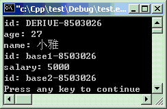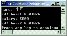 #include<iostream>#include<string>using namespacestd;classCBase1 { string name; string id;public: CBase1(string s1, string s2) : name(s1), id("base1-"+s2) { }voidshow() { cout << "name: " << name << endl; cout << "id: " << id << endl; } };classCBase2 {intsalary; string id;public: CBase2(inty, string s2) : salary(y), id("base2-"+s2) { }voidshow() { cout << "salary: " << salary << endl; cout << "id: " << id << endl; } };classCDerive :publicCBase1,publicCBase2 { string id;intage;public: CDerive(string s1,inta, string s2,inty) : age(a), id("DERIVE-"+s2), CBase1(s1, s2), CBase2(y, s2) { } };intmain ( ) { CDerive d("小雅", 27, "8503026", 5000); //d.show(); //编译出错,不知从哪个基类继承。 d.CBase1::show(); d.CBase2::show();return0; }