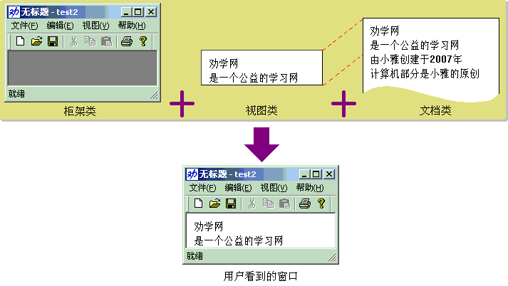 文档类主要用来处理数据。例如画一个图,图的各节点座标、颜色、线条的粗细等都有文档类来处理,文件的保存和打开等当然也是文档类来处理。视图类主要处理数据的显示,例如:文字在窗口中显示、键盘鼠标操作等都是由视图类来处理。视图类不断地从文档类取数据,不断地对文档类传送数据。当文档类数据较多时,视图类显示的数据只是文档类的一部分。