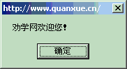 #include<windows.h>intAPIENTRY WinMain(HINSTANCE hInstance, //当前窗口实例句柄 HINSTANCE hPrevInstance, //前一个实例句柄,Win32下为NULL LPSTR lpCmdLine, //命令行参数字符intnCmdShow //窗口的显示方式 ) { MessageBox(NULL,"劝学网欢迎您!", "http://www.quanxue.cn/", MB_OK); //通用对话框return0; //函数返回值 }