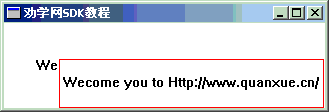 sizeof(wc)); wc.style = CS_HREDRAW | CS_VREDRAW; wc.lpfnWndProc = WndProc; wc.cbClsExtra = 0; wc.cbWndExtra = 0; wc.hInstance = hInst; wc.hIcon = LoadIcon(NULL, IDI_APPLICATION); wc.hCursor = LoadCursor(NULL, IDC_ARROW); wc.hbrBackground = (HBRUSH)GetStockObject(WHITE_BRUSH); wc.lpszMenuName = NULL; wc.lpszClassName = (LPCSTR)szClassName;return(RegisterClass(&wc)); } //初始化窗口类 BOOL InitInstance(HINSTANCE hInst, LPCSTR szClassName,intnCmdShow) { HWND hWnd; hWnd = CreateWindow(szClassName, "劝学网SDK教程", WS_OVERLAPPEDWINDOW, CW_USEDEFAULT, CW_USEDEFAULT, 400, 120, NULL, NULL, hInst, NULL);if(!hWnd)returnFALSE; ShowWindow(hWnd, nCmdShow); UpdateWindow(hWnd);returnTRUE; } LRESULT CALLBACK WndProc(HWND hWnd, UINT message, WPARAM wParam, LPARAM lParam) { PAINTSTRUCT ps; HDC hdc; TCHAR szHello[50]="Wecome you to Http://www.quanxue.cn/";switch(message) {caseWM_PAINT: //重画窗口消息 hdc = BeginPaint(hWnd, &ps); //开始描画 RECT rc; GetClientRect(hWnd, &rc); //取窗口有效区域 //显示文字(横向对中|不自动回行|纵向对中) DrawText(hdc, szHello, (int)strlen(szHello), &rc, DT_CENTER|DT_SINGLELINE|DT_VCENTER); EndPaint(hWnd, &ps); //结束描画break;caseWM_DESTROY: //关闭窗口消息 PostQuitMessage(0); //发送关闭消息break;default:returnDefWindowProc(hWnd, message, wParam, lParam); //缺省窗口消息处理函数 } return 0; }