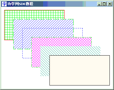 switch(message) {caseWM_PAINT: hdc = BeginPaint(hWnd, &ps); DrawGr(hdc); EndPaint(hWnd, &ps);break;caseWM_DESTROY: PostQuitMessage(0);break;default:returnDefWindowProc(hWnd, message, wParam, lParam); }return0; } //画6个方框 int DrawGr(HDC hdc) { HPEN hPen, hOldPen; //画笔 HBRUSH hBrush, hOldBrush; //画刷 hPen = CreatePen(PS_SOLID, 1, RGB(255, 0, 0)); //画笔 hOldPen = (HPEN)SelectObject(hdc, hPen); hBrush = CreateHatchBrush(HS_CROSS, RGB(0, 255, 0)); //方格刷 hOldBrush = (HBRUSH)SelectObject(hdc, hBrush); Rectangle(hdc, 10, 10, 210, 110); //画矩形 DeleteObject(hPen); //删除新笔 DeleteObject(hBrush); //删除新刷 hPen = CreatePen(PS_DASH, 1, RGB(0, 255, 0)); //画笔 SelectObject(hdc, hPen); hBrush = CreateHatchBrush(HS_BDIAGONAL, RGB(0, 0, 255)); //45度斜线刷 SelectObject(hdc, hBrush); Rectangle(hdc, 40, 40, 240, 140); //画矩形 DeleteObject(hPen); //删除新笔 DeleteObject(hBrush); //删除新刷 hPen = CreatePen(PS_DOT, 1, RGB(0, 0, 255)); //画笔 SelectObject(hdc, hPen); SelectObject(hdc, GetStockObject(NULL_BRUSH)); //注意:选用空画刷 Rectangle(hdc, 70, 70, 270, 170); //画矩形 DeleteObject(hPen); //删除新笔 hPen = CreatePen(PS_DASHDOTDOT, 1, RGB(0, 255, 0)); //画笔 SelectObject(hdc, hPen); hBrush = CreateHatchBrush(HS_DIAGCROSS, RGB(255, 0, 255)); //交叉斜线刷 SelectObject(hdc, hBrush); Rectangle(hdc, 100, 100, 300, 200); //画矩形 DeleteObject(hPen); //删除新笔 DeleteObject(hBrush); //删除新刷 hPen = CreatePen(PS_NULL, 1, NULL); //注意:无边框画笔 SelectObject(hdc, hPen); hBrush = CreateHatchBrush(HS_FDIAGONAL, RGB(0, 154, 154)); //45度反斜线刷 SelectObject(hdc, hBrush); Rectangle(hdc, 130, 130, 330, 230); //画矩形 DeleteObject(hPen); //删除新笔 DeleteObject(hBrush); //删除新刷 hPen = CreatePen(PS_SOLID, 1, RGB(0, 0, 0)); //画笔 SelectObject(hdc, hPen); hBrush = CreateSolidBrush(RGB(255, 255, 217)); //实心画刷 SelectObject(hdc, hBrush); Rectangle(hdc, 160, 160, 360, 260); //画矩形 SelectObject(hdc, hOldPen); //恢复旧笔 SelectObject(hdc, hOldBrush); //恢复旧刷 DeleteObject(hPen); //删除新笔 DeleteObject(hBrush); //删除新刷return0; }