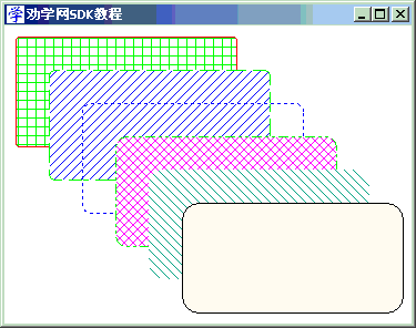 int DrawGr(HDC hdc) { HPEN hPen, hOldPen; //画笔 HBRUSH hBrush, hOldBrush; //画刷 hPen = CreatePen(PS_SOLID, 1, RGB(255, 0, 0)); //画笔 hOldPen = (HPEN)SelectObject(hdc, hPen); hBrush = CreateHatchBrush(HS_CROSS, RGB(0, 255, 0)); //方格刷 hOldBrush = (HBRUSH)SelectObject(hdc, hBrush); RoundRect(hdc, 10, 10, 210, 110, 5, 5); //画矩形 DeleteObject(hPen); //删除新笔 DeleteObject(hBrush); //删除新刷 hPen = CreatePen(PS_DASH, 1, RGB(0, 255, 0)); //画笔 SelectObject(hdc, hPen); hBrush = CreateHatchBrush(HS_BDIAGONAL, RGB(0, 0, 255)); //45度斜线刷 SelectObject(hdc, hBrush); RoundRect(hdc, 40, 40, 240, 140, 10, 10); //画矩形 DeleteObject(hPen); //删除新笔 DeleteObject(hBrush); //删除新刷 hPen = CreatePen(PS_DOT, 1, RGB(0, 0, 255)); //画笔 SelectObject(hdc, hPen); SelectObject(hdc, GetStockObject(NULL_BRUSH)); //注意:选用空画刷 RoundRect(hdc, 70, 70, 270, 170, 15, 15); //画矩形 DeleteObject(hPen); //删除新笔 hPen = CreatePen(PS_DASHDOTDOT, 1, RGB(0, 255, 0)); //画笔 SelectObject(hdc, hPen); hBrush = CreateHatchBrush(HS_DIAGCROSS, RGB(255, 0, 255)); //交叉斜线刷 SelectObject(hdc, hBrush); RoundRect(hdc, 100, 100, 300, 200, 20, 20); //画矩形 DeleteObject(hPen); //删除新笔 DeleteObject(hBrush); //删除新刷 hPen = CreatePen(PS_NULL, 1, NULL); //注意:无边框画笔 SelectObject(hdc, hPen); hBrush = CreateHatchBrush(HS_FDIAGONAL, RGB(0, 154, 154)); //45度反斜线刷 SelectObject(hdc, hBrush); RoundRect(hdc, 130, 130, 330, 230, 25, 25); //画矩形 DeleteObject(hPen); //删除新笔 DeleteObject(hBrush); //删除新刷 hPen = CreatePen(PS_SOLID, 1, RGB(0, 0, 0)); //画笔 SelectObject(hdc, hPen); hBrush = CreateSolidBrush(RGB(255, 255, 217)); //实心画刷 SelectObject(hdc, hBrush); RoundRect(hdc, 160, 160, 360, 260, 30, 30); //画矩形 SelectObject(hdc, hOldPen); //恢复旧笔 SelectObject(hdc, hOldBrush); //恢复旧刷 DeleteObject(hPen); //删除新笔 DeleteObject(hBrush); //删除新刷