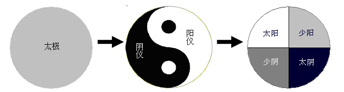 周易的系辞中说:“有太极,是生两仪, 两仪生四象, 四象生八卦,八卦定吉凶,吉凶生大业。”易经认为,盘古开天地之前,也就是宇宙大爆炸之前,宇宙就是一太极(即物理学中所说“质点”),这个太极之内包含阴阳二气,阴阳二气交融在一起,相对地来说比较安静稳定的状态,这时称之为太极状态,简称太极。当内部的阴阳二气发生交融变化时,我们称之为两仪状态,简称两仪。
