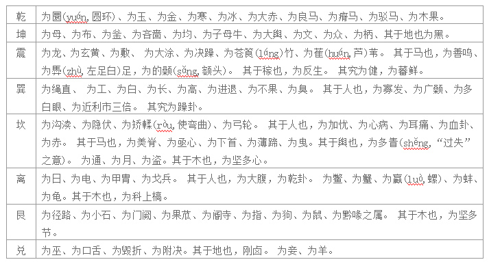 在人体方面,“乾为首,坤为腹,震为足,巽为股,坎为耳,离为目,艮为手,兑为口。”在动物方面,“乾为马,坤为牛,震为龙,巽为鸡,坎为豕,离为雉,艮为狗,兑为羊。” 这些象征性的比喻已经很难象前面一样说出一个明确的理由。更细的比喻见下表,初学者仅作参考: