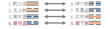 古人为了方便我们记忆,已经为大家编制了形象生动的口诀,大家只要记住口诀就能记住卦象,但更重要的是记住顺序的读音。箭头所示的一对卦象,其阴阳正好相反,我们将这样的一对卦称为“反卦”,也叫“错卦”。另外,上下颠倒的2 个卦为“覆卦”,也叫“综卦”,震和艮、巽和兑是2组综卦。