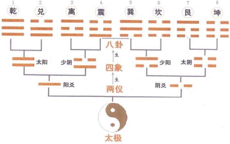 ”。因人居天地之中,所以在四象的符号中间分别加上阴、阳就成了八卦:离 、坤 、艮 、震 、乾 、坎 、巽 、兑 。