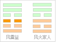 通过这样的十八变,我们就得到了卦数,然后就可以画出卦象来。我们假设18变得出的6个数为7、8、6、8、7、7,其中只有一个变爻,卦象如右图并记为:“益”之“家人”,注意,画卦时是从下往上画。如何来判断这个卦所测的事情吉凶呢?因为这个卦只有一个变爻,我们就可以通过“益”卦的六三爻辞来判断。关于卦辞、爻辞如何解读我们将在后面章节详细介绍,所以你还需要继续学习后面章节。
