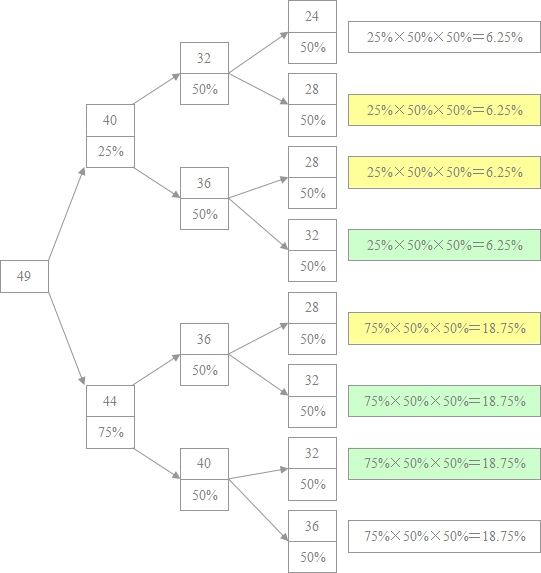 用同样的方法推理,当40根一分为二,最后A2的可能性为32或36,其概率各占50%,当44一分为二时,A2的可能性为36和40,其概率也是各占50%,这样A2总共为三种情况:32、36、40,再由这三种情况推理下去,其概率结果如下图: