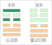 金钱卦习惯将变爻称之为动爻,动爻对于六个爻来说,出两年概率完全相同,因此这种方法起卦往往会有多个动爻出现,这和揲蓍方法相比概率是不相同的。现举一例,假定我们摇卦之后得到:“-、-、=、×、=、○”,这个卦为“山泽损”,四爻和六爻为动爻,变卦为“雷泽归妹”